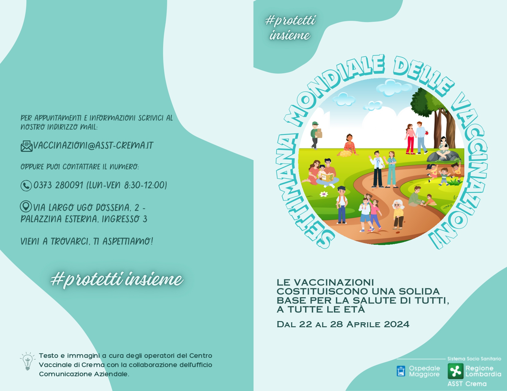 In occasione della settimana mondiale delle vaccinazioni che si terrà dal 22 al 28 aprile p.v., si allega la locandina che ricorda l'importanza delle vaccinazioni nei vari momenti di vita da parte di ATS Valpadana.