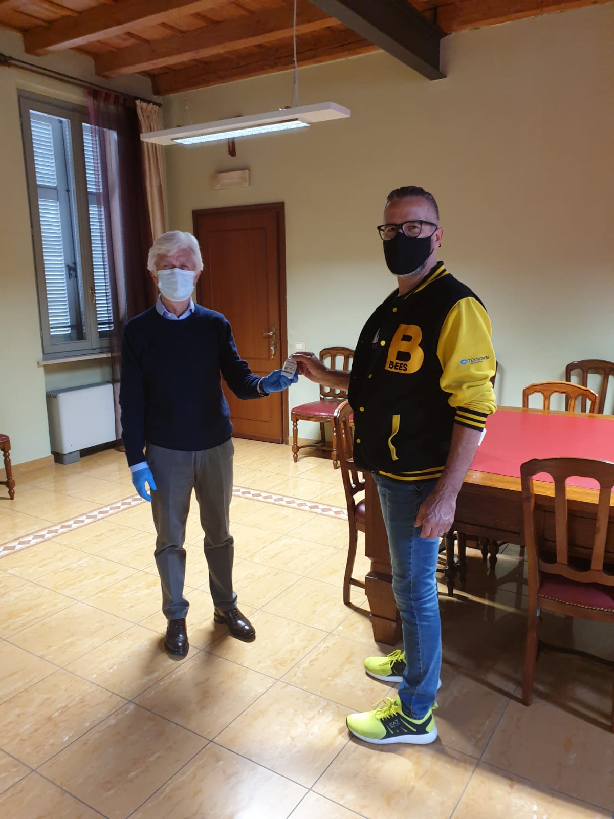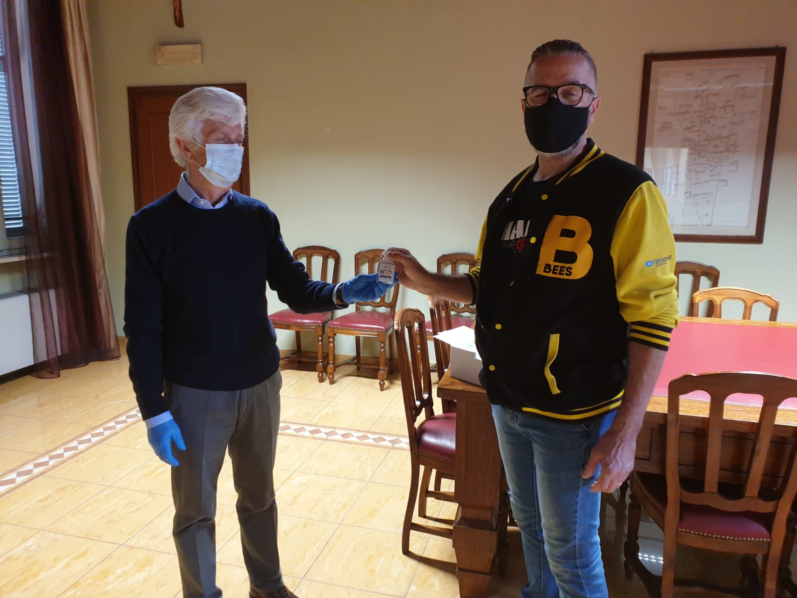 Di seguito, alcune immagini del momento in cui il Presidente Erminio Tacca della Pallacanestro Offanengo Bees dona al Sindaco Gianni Rossoni i dpi di sicurezza da consegnare ai dipendenti comunali: