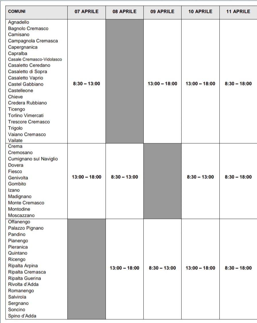 L'ATS Valpadana comunica che per gli ultra ottentenni offaneghesi che hanno già effettuato la richiesta di vaccinazione tramite il portale di Regione Lombardia e che non sono stati ancora chiamati, possono recarsi senza bisogno di prenotazione direttamente al Centro vaccinale di Crema presso il Tribunale per la somministrazione del vaccino nei seguenti giorni: