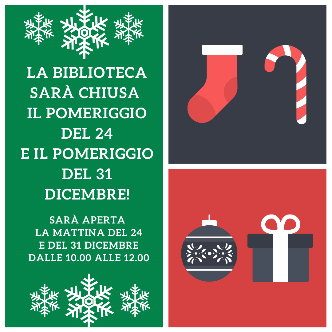 La Biblioteca Comunale sarà chiusa, oltre che nei giorni di festa, nei pomeriggi di giovedì 24 e giovedì 31 dicembre.