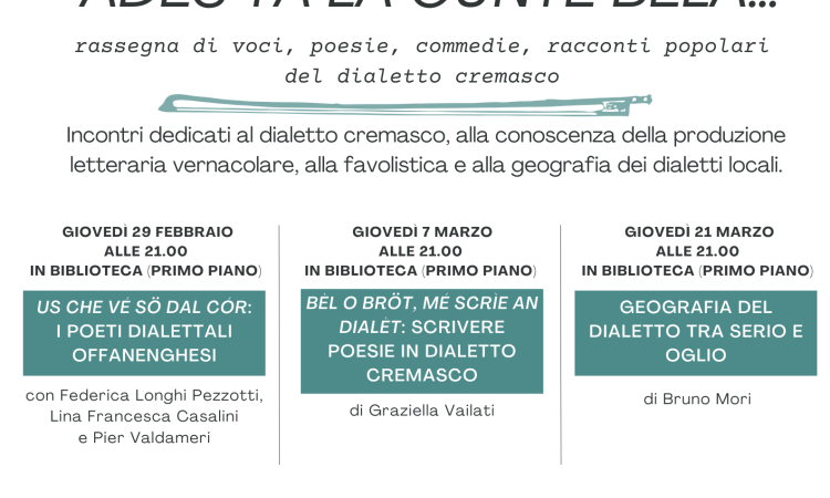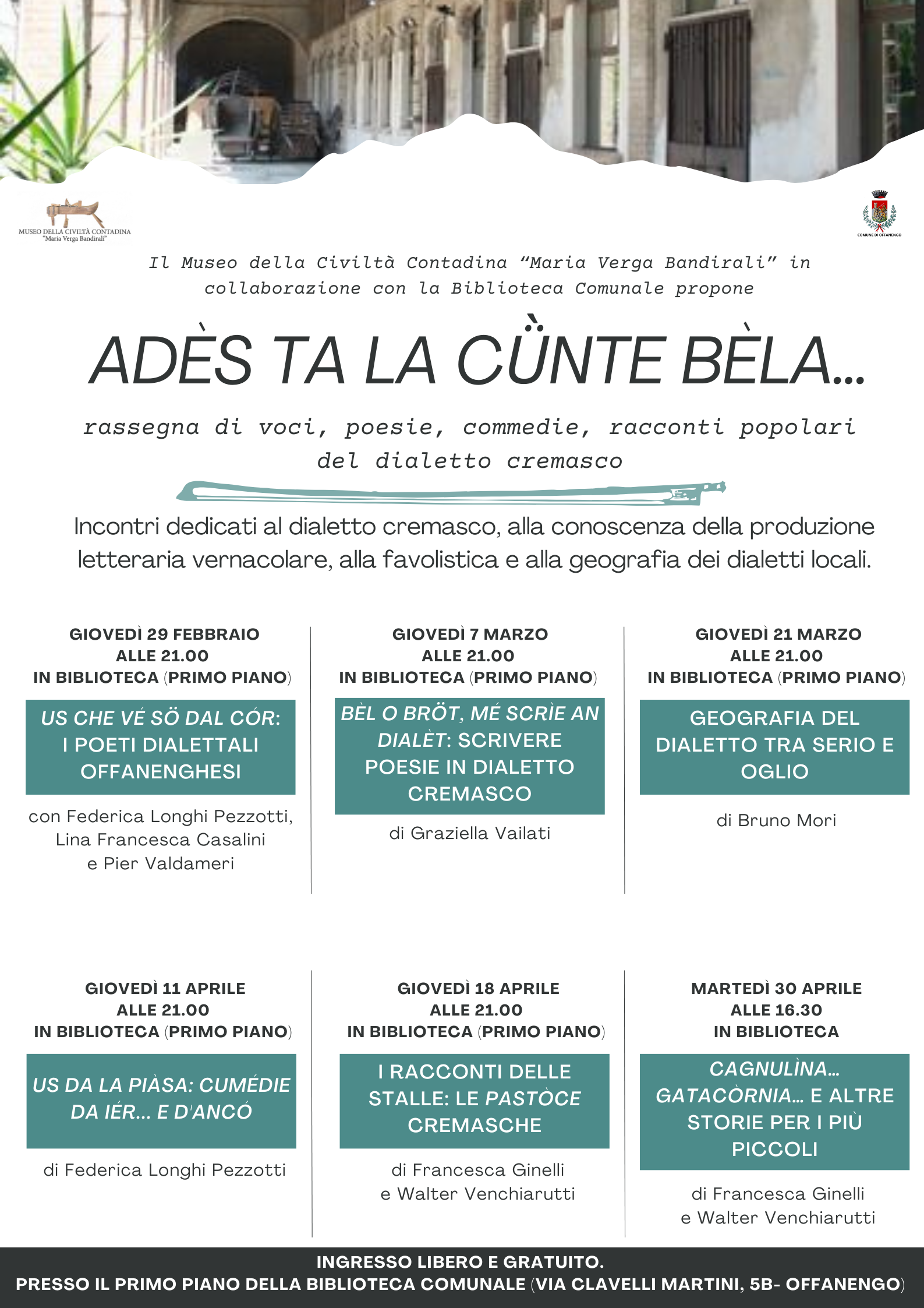 Il Museo della civiltà contadina "Maria Verga Bandirali", in collaborazione con la Biblioteca comunale di Offanengo, organizza un ciclo di sei incontri pubblici dedicati al dialetto cremasco, alla conoscenza della produzione letteraria vernacolare, alla favolistica e alla geografia dei dialetti locali.