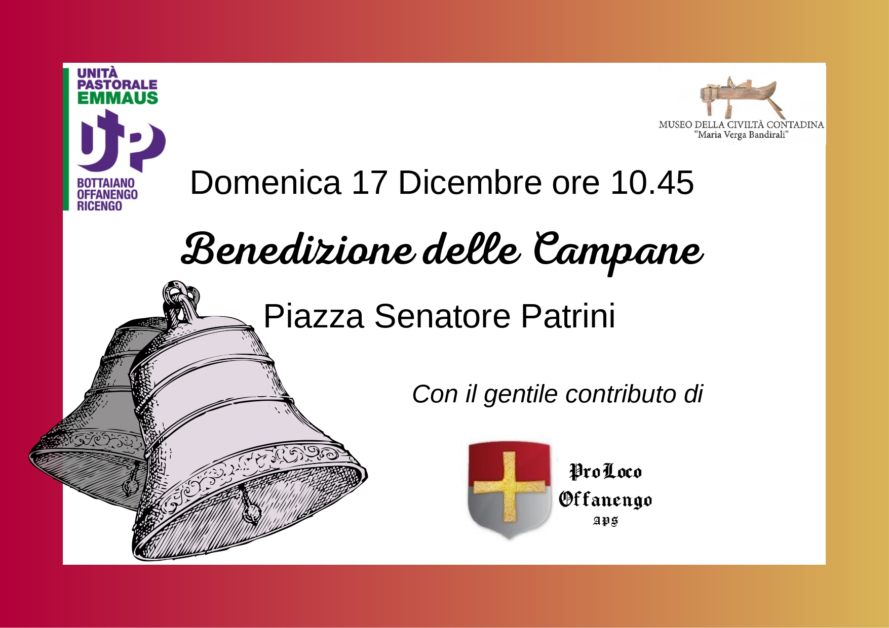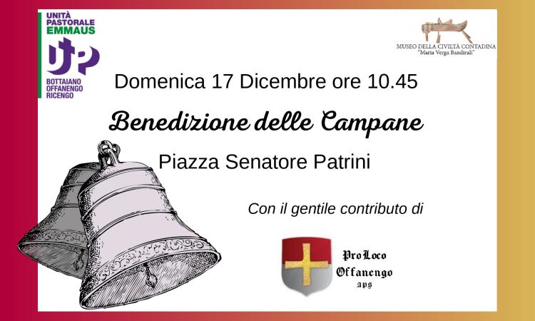 La cittadinanza è invitata alla cerimonia di benedizione delle campane, che si terrà domenica 17 dicembre alle ore 10:45 in piazza Patrini. Per l'occasione, si terrà un concerto delle campane a terra prima della loro ricollocazione sul campanile.