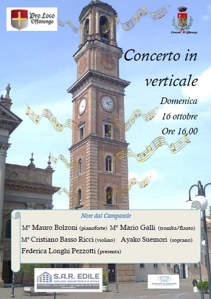 La Pro Loco Offanengo propone per domenica 16 Ottobre alle ore 16,00 in Piazza Sen. Patrini il CONCERTO IN VERTICALE, un concerto che oltre alla bravura certa degli esecutori, metterà in evidenza ciò che rappresenta per noi Offanenghesi il nostro CAMPANILE.