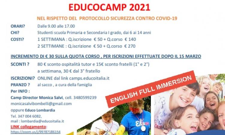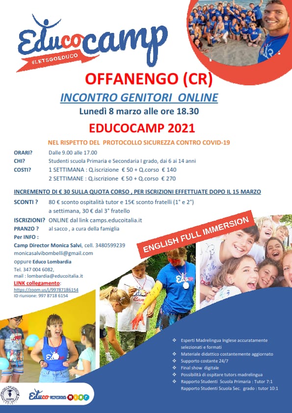 Lunedì 8 marzo 2021 alle ore 18.30 si terrà un incontro con i genitori tramite la piattaforma zoom per la presentazione del progetto Educamp 2021 promosso dall'Istituto Comprensivo di Offanengo.