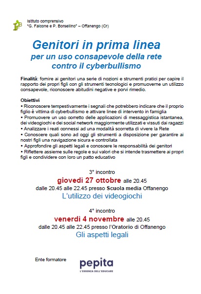 Tre incontri organizzati dall'Istituto Comprensivo G. Falcone e P. Borsellino e indirizzati ai genitori con la finalità di fornire una serie di nozioni e strumenti pratici per capire il rapporto dei propri figli con gli strumenti tecnologici e promuoverne un utilizzo consapevole, riconoscere abitudini negative e porvi rimedio. Gli incontri si terranno dalle ore 20.45 alle ore 22.45 secondo il seguente calendario: