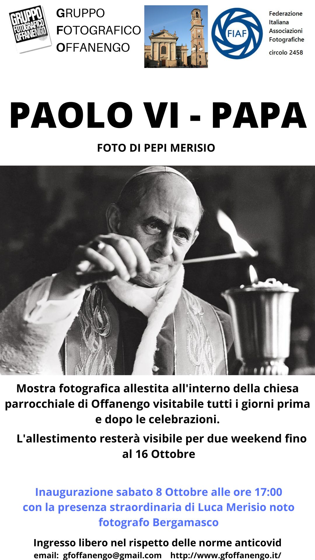 Sabato 8 Ottobre alle ore 17:00 a Offanengo all’interno della chiesa parrocchiale ci sarà l’inaugurazione della mostra di Paolo VI Papa con le foto di Pepi Merisio noto fotografo Bergamasco. All’inaugurazione sarà presente Luca Merisio fotografo e figlio dello stimato artista. La mostra, interamente a cura del GFO Gruppo Fotografico Offanengo, resterà aperta per due weekend fino al 16 Ottobre e sarà visitabile prima e dopo le celebrazioni.