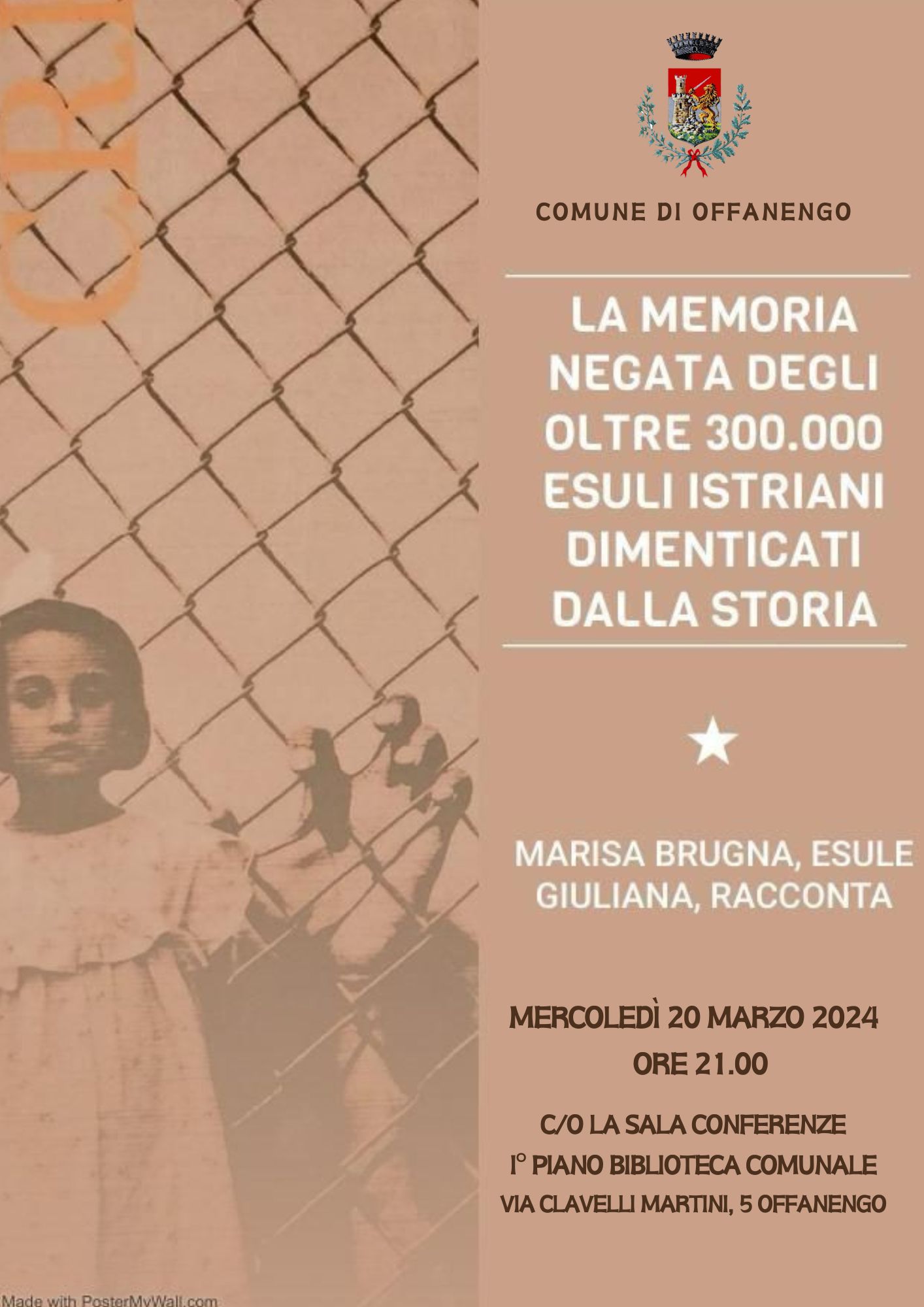 Durante l'incontro Marisa Brugna, autrice del libro “Memoria negata” racconterà la sua storia. Marisa Brugna, esule Giuliana, è una tenace promotrice della memoria della tragedia dell’esodo, delle Foibe e delle persecuzioni subite alla fine della Seconda Guerra Mondiale dagli italiani nelle terre dell’Istria, di Fiume e della Dalmazia.