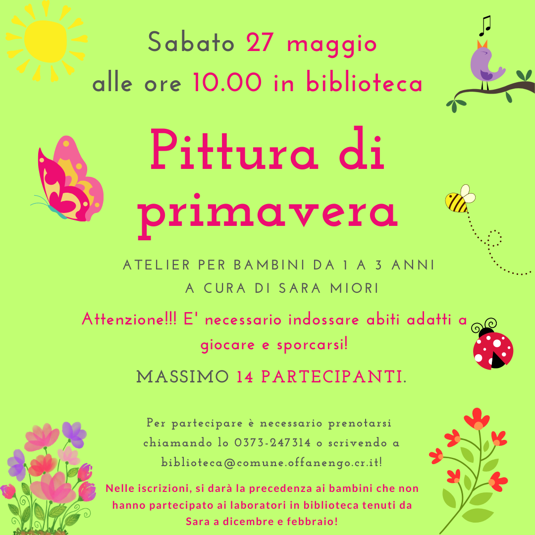Per partecipare è necessario prenotarsi chiamando lo 0373-247314 o scrivendo a biblioteca@comune.offanengo.cr.it!