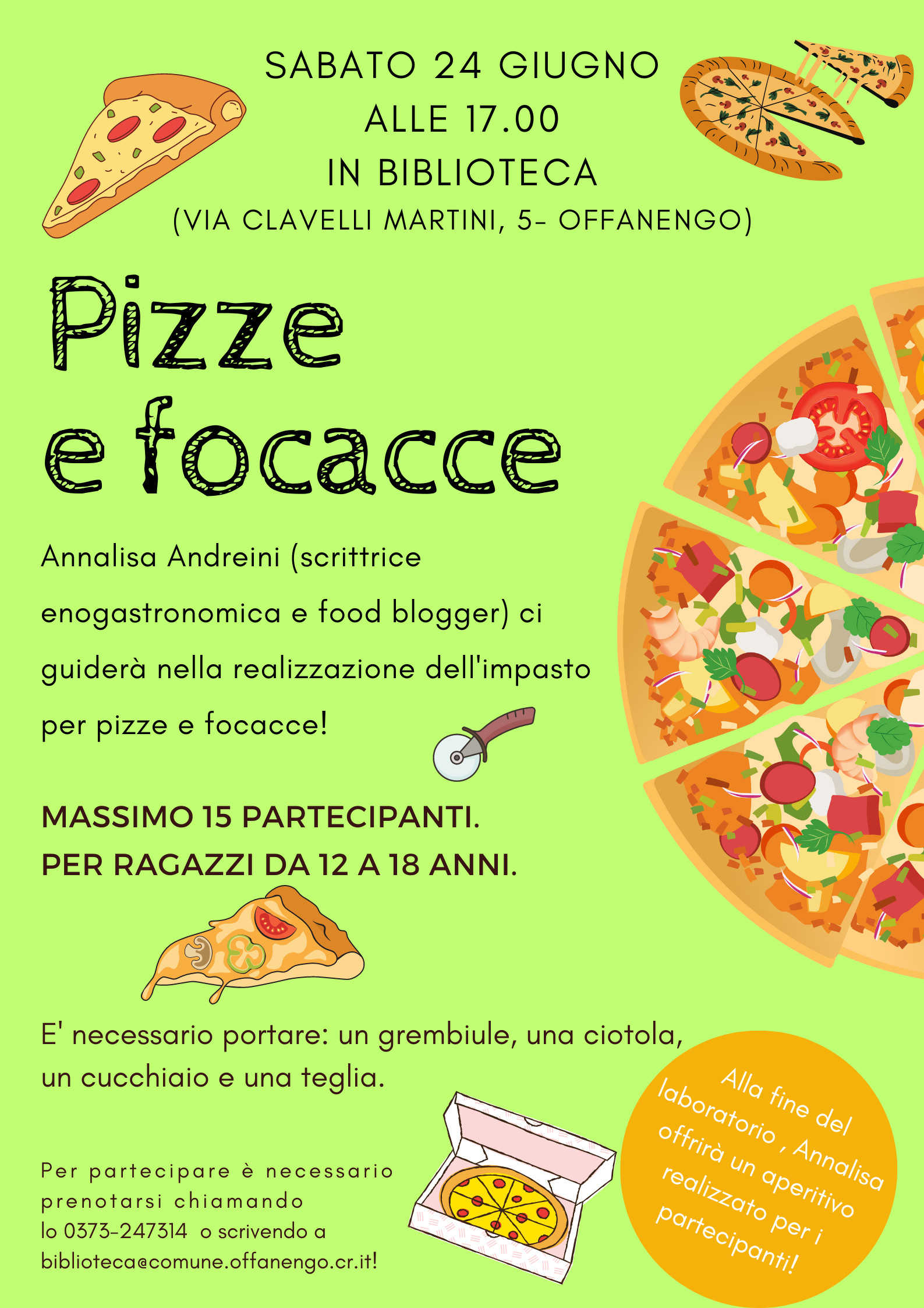 Per partecipare è necessario prenotarsi chiamando lo 0373-247314 o scrivendo a biblioteca@comune.offanengo.cr.it.