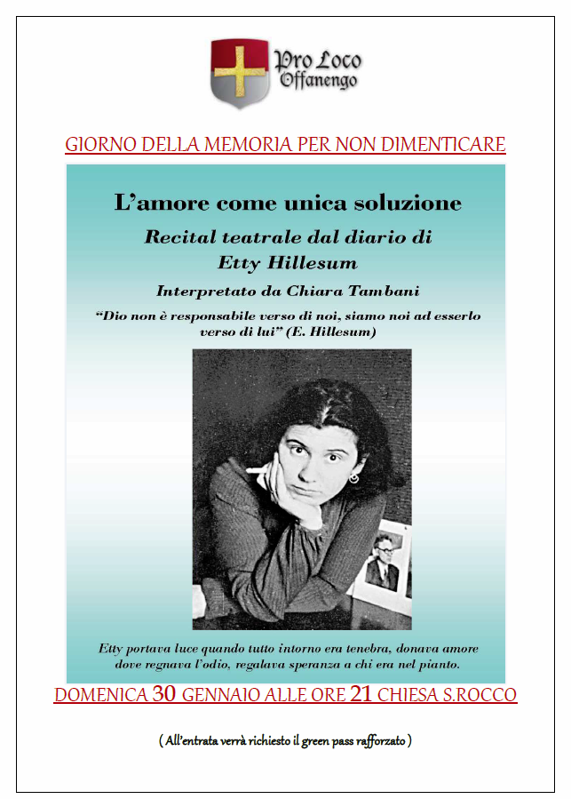 Con prudenza e nel rispetto delle normative vigenti, la Pro Loco di Offanengo propone nella serata di Domenica 30 gennaio presso la chiesetta di S. Rocco alle ore 21, un evento dedicato al giorno della MEMORIA per NON DIMENTICARE e ricordare che la pace si conquista ogni giorno. Potremo ascoltare dalla voce dell’attrice Chiara Tambani l’interpretazione di un racconto, tratto dal romanzo di Etty Hillesum una giovane donna di Amsterdam, dal titolo emblematico. “L’amore come unica soluzione”.